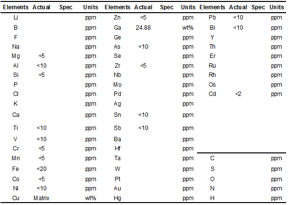我们生产CuGa靶材可实现高转换效率的稳定品质,高纯度、高密度且组织均质,而且可以大范围的调整Ga的含量 。下面的表格是4N的高纯铜镓(75:25wt%)合金溅射靶的成分分析证明书。采用分析方法:1.使用ICP-OES 对金属元素进行分析;2.使用LECO 进行气体元素分析。