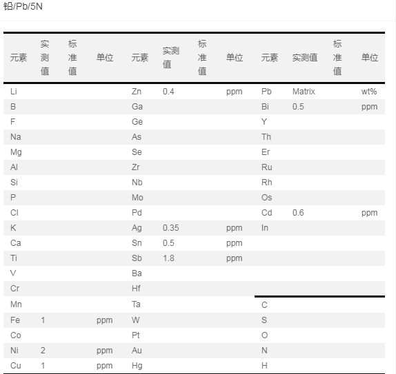 我们生产的高纯度铅溅射靶材,以下表格是5N以上高纯铅溅射靶的成分分析证明书。分析方法:1,使用GDMS对金属杂质元素进行分析;2,使用LECO进行气体元素分析。
